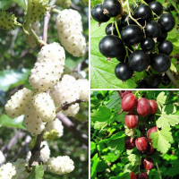 В состав комплекта входят: Смородина Память Вавилова, Крыжовник Северный Капитан и Шелковица белая.